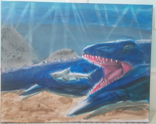 Here is a scenery I painted of the great Mosasaurus hunting for a meal (inspired from The Jurassic World movie)