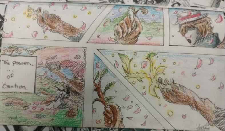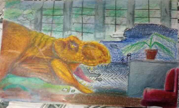 The dinosaur picture is about my first time watching Jurassic Park, my favourite movie. The drawing on the bottom right resembles a Japanese comic book strip called manga. The story is about how a guy grows a tree using magic.