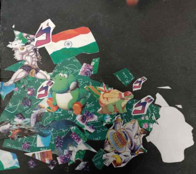 The collages are pieces about cool things I like. The one on the bottom left is about things that go through my mind when I draw, and the one adjacent to it is a scene showing the result of all those thoughts.