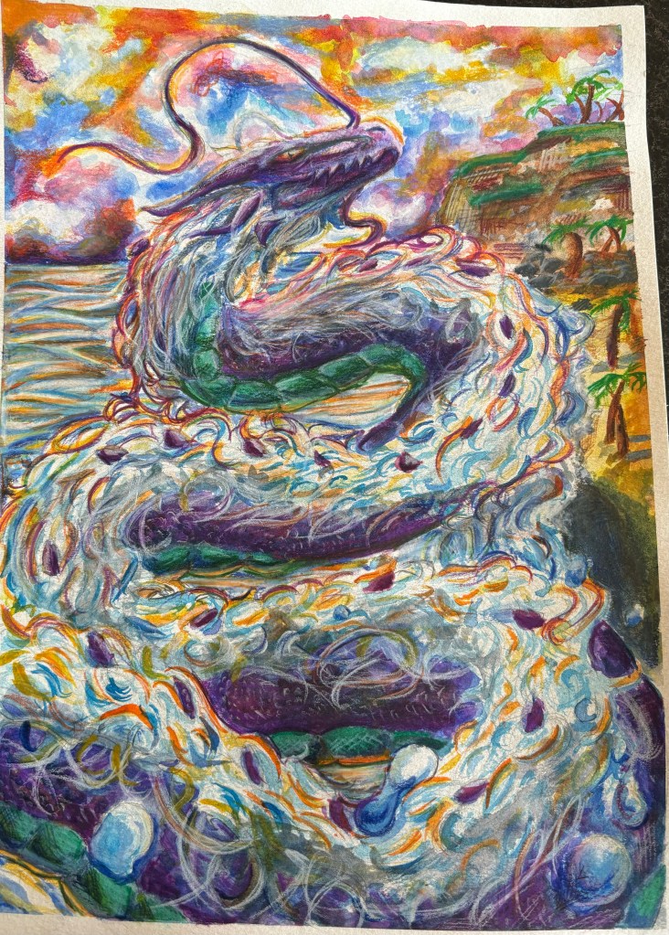 This art piece below is called the Son of the Seas. It focuses on a large Japanese styled dragon rising from the waters during a sunset, in which the dragon shows a graceful and gentle nature.