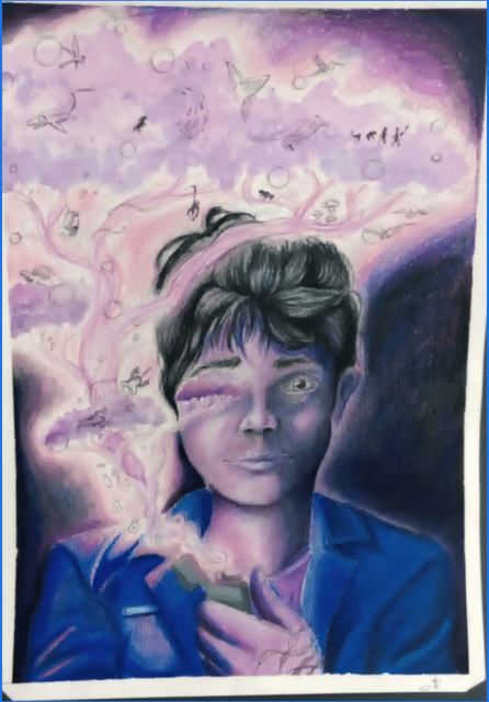 In it, I’m holding a lighter, but the flame transforms into a tree—my take on the Norse world tree, a symbol that connects life, death, and imagination. I used watercolour, Prismacolor, and ink pen to bring it to life, layering texture and movement to capture both emotion and flow.